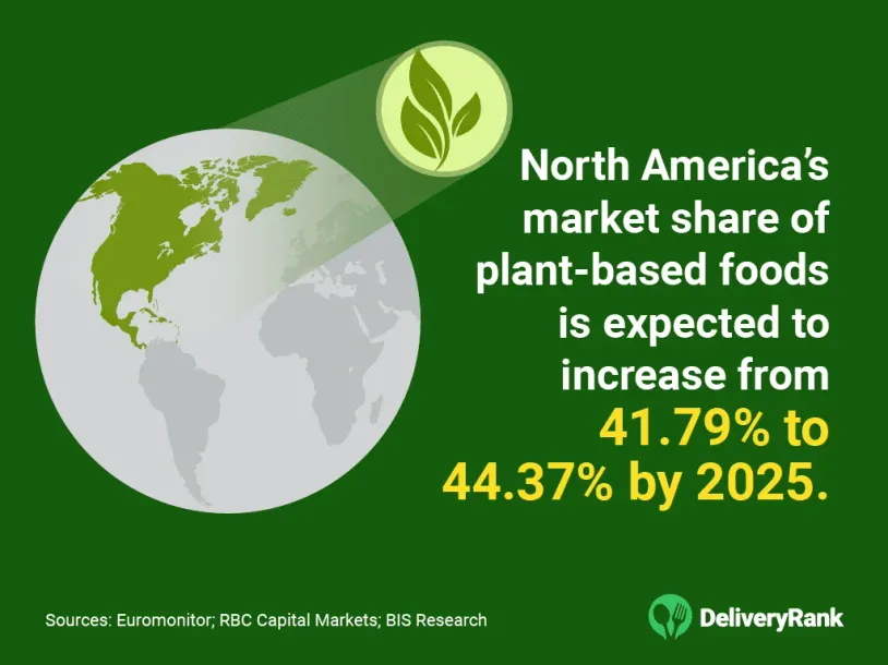 In 2019, North America’s market share of plant-based products stood at around 41.79%. By 2025, this is expected to grow to 44.37%, while both Europe and Asia Pacific’s market share will decline slightly.