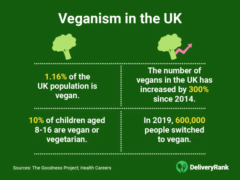 The number of vegans in the UK has increased by 300% between 2014 and 2019. Roughly 1.16% of the population now identifies as vegan. In 2019, 600,000 people adopted a vegan lifestyle — the highest figure so far.