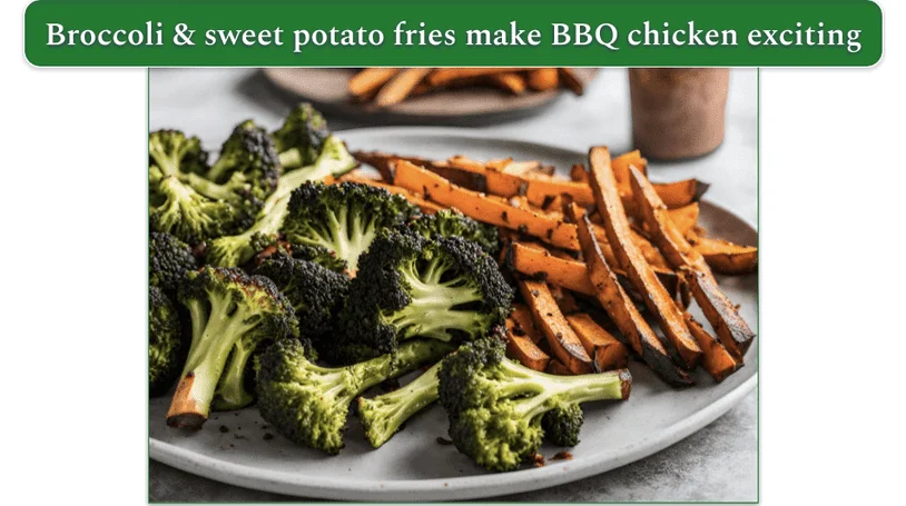 Broccoli and sweet potato fries are a flavorful pairing for BBQ chicken. The smoky paprika on the fries complements the tangy barbecue sauce, while the roasted broccoli adds a light, nutty contrast. Together, they provide a mix of savory and sweet flavors that balance BBQ chicken beautifully.
