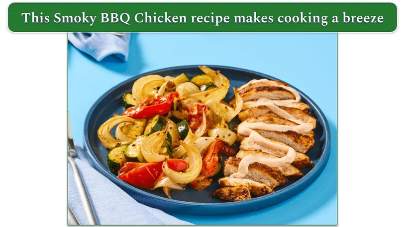 Author’s tip: This BBQ chicken recipe from EveryPlate pairs the meat with red pepper crema, roasted tomato, zucchini, and onions. It offers a quick and easy way to enjoy BBQ flavor indoors. This dish is not only delicious but also light and balanced, making it a great option for busy nights.