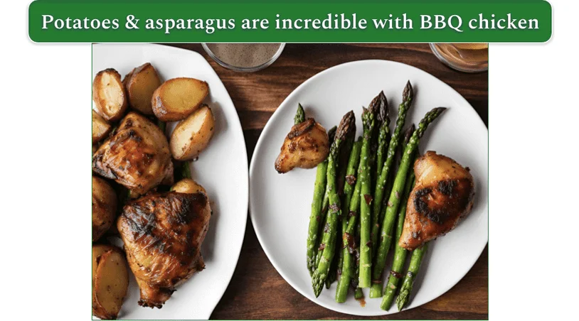 Common sides for BBQ include roasted vegetables, salads, and potatoes. For instance, the Roasted Potatoes with Garlic & White Wine Asparagus recipe provides a delicious balance of hearty potatoes and tender, flavorful asparagus.The roasted potatoes pair perfectly with BBQ chicken, offering a crispy, savory side. Meanwhile, the garlic and white wine asparagus adds a light, tangy contrast, making this combination a well-rounded and flavorful choice to accompany BBQ chicken.