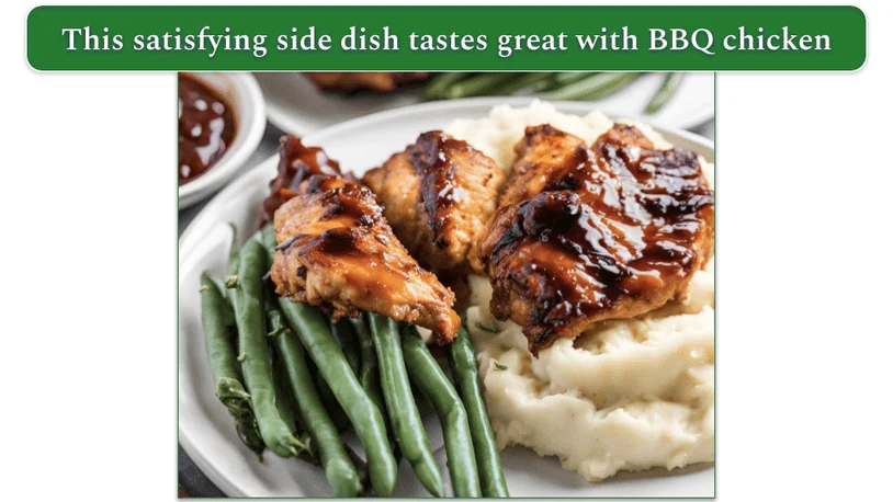 This side dish is both comforting and easy to prepare, making it ideal for casual cookouts or family dinners. The blend of buttery potatoes and crisp green beans ensures a side that’s both indulgent and vibrant, complementing BBQ chicken’s bold flavors seamlessly.