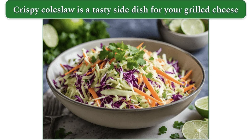 This side goes really well with grilled cheese. The crisp cabbage, sweet carrots, and bell pepper offer a satisfying crunch, while the tangy lime dressing adds a burst of flavor that balances the richness of the sandwich. The sesame seeds provide an extra crunch, making it a lively complement to the savory grilled cheese. It's also really quick to prepare!