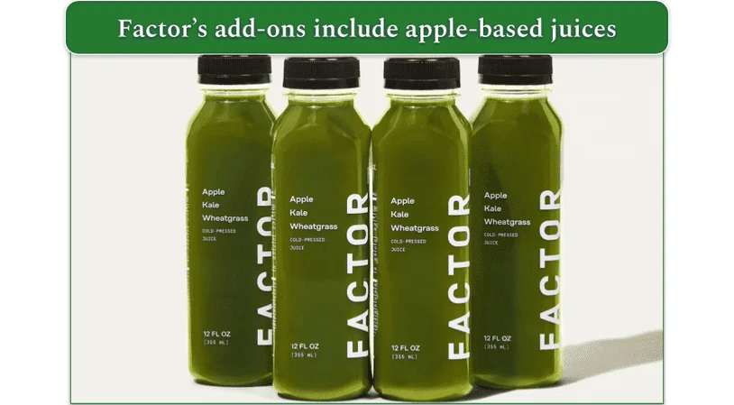 Author’s Tip: Factor offers a great range of add-ons that can be ordered alongside its prepared meals. Choose from a range of flavor combinations, many of which contain apple. These juices are fantastic for on-the-go hydration and there’s no limit to how many you can order.