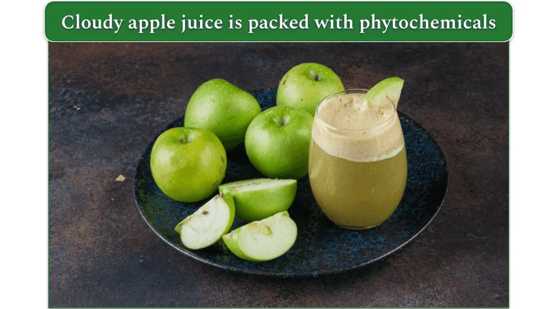 Cloudy apple juice is superior to clear apple juice in terms of health benefits. It retains more dietary fiber, and cloudy apple juice contains a higher concentration of phytochemicals¹⁹. The difference between the 2 lies in their processing.