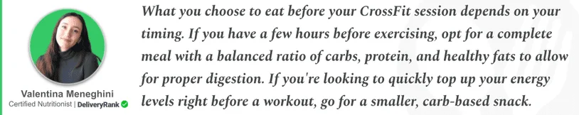 For endurance-focused CrossFit workouts, prioritize slow-digesting carbs such as whole grains, oats, or sweet potatoes. Make sure your body has enough time to digest them, so I would recommend these as part of your meal a few hours before CrossFit rather than as a snack. These help sustain energy throughout longer sessions. Including a small amount of protein, like eggs or Greek yogurt, can assist in preventing muscle breakdown during extended exercise.