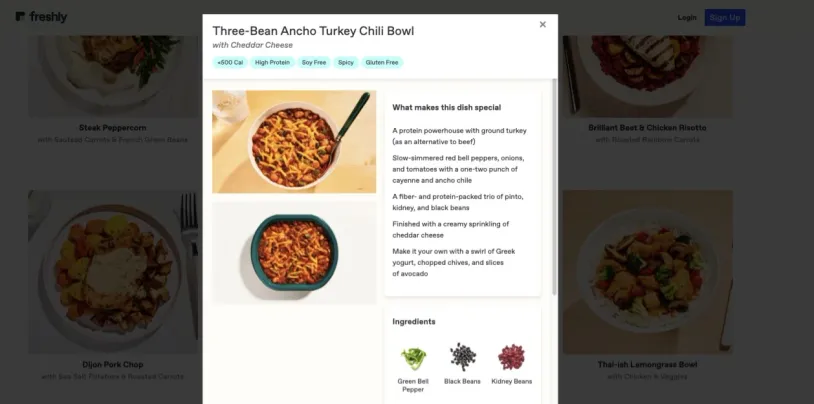 There aren’t that many veggie options available, but this is an area that Freshly is starting to expand. It recently introduced its Purely Plant plan, which consists of around 5 weekly plant-based meals such as the Middle Eastern Falafel Bowl with Garlicky Tahini Sauce and Whole Grains.