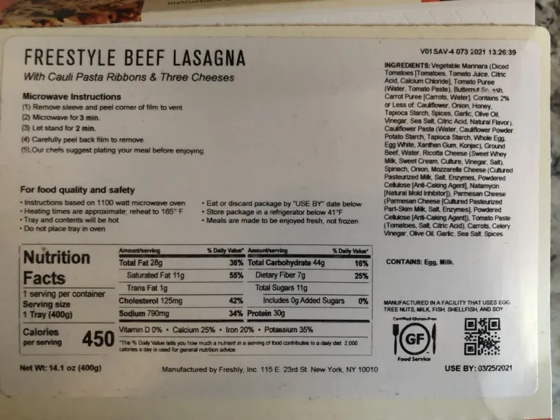 On its website, Freshly says its meals are “less processed” and use “less of the ingredients you can’t pronounce.” Looking at the back of the boxes, I’d agree the ingredient list is shorter than many of the other microwavable meals you see in supermarkets. That said, a fresh salad would be an unfair comparison.