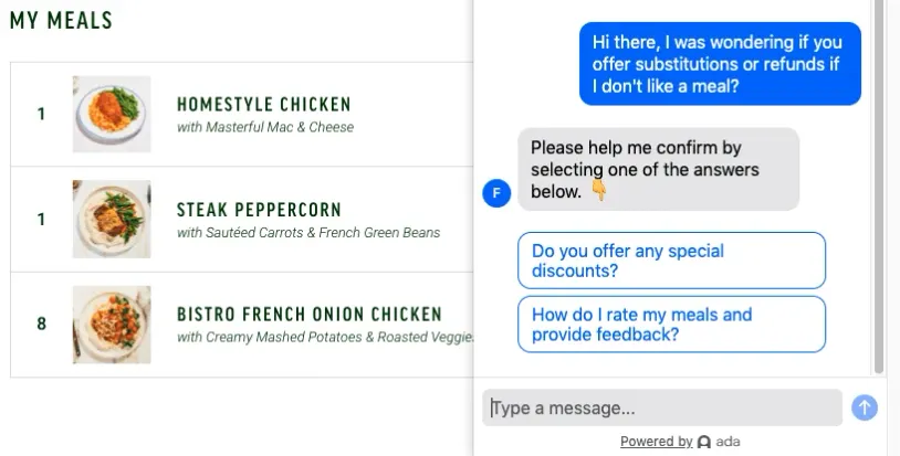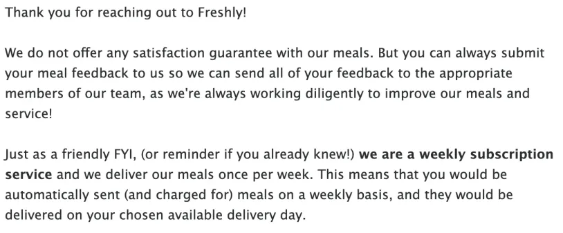 I also wanted to know if Freshly had any satisfaction guarantee. I asked the chatbot if the company would replace or refund any meals I didn't like. It was clear that the chatbot didn't understand my question.